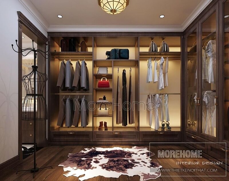 Morehome gợi ý cho khách hàng mẫu tủ quần áo âm tường gỗ óc chó tự nhiên phong cách tân cổ điển trong nhà biệt thự cao cấp