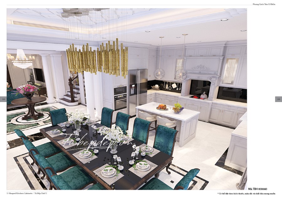 Bố trí phòng ăn liền phòng bếp tạo một không gian mở thoáng đãng dù được thiết kế theo phong cách tân cổ điển cho biệt thự, nhà phố