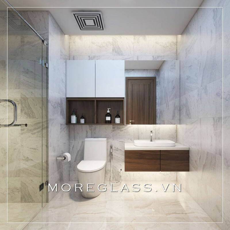 KTS sử dụng vách kính ngăn cách giữa nhà vệ sinh và nhà tắm tạo cảm giác thông thoáng và rộng rãi, sang trọng hơn.