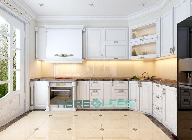 Thiết kế mẫu kính ốp bếp màu kem nhẹ nhàng kết hợp với tủ bếp cùng gam màu cho phòng bếp thêm ấm cúng
