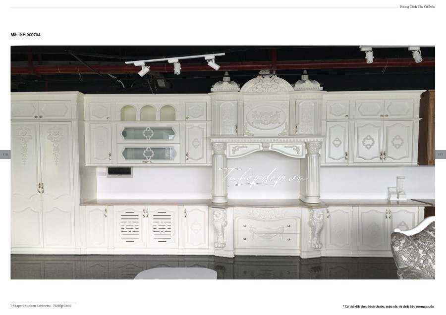 Chọn lựa tủ bếp tân cổ điển màu trắng chạy dài kiểu chữ i phù hợp cho không gian cao cao cấp, rộng lớn của chung cư cao cấp, biệt thự, nhà phố