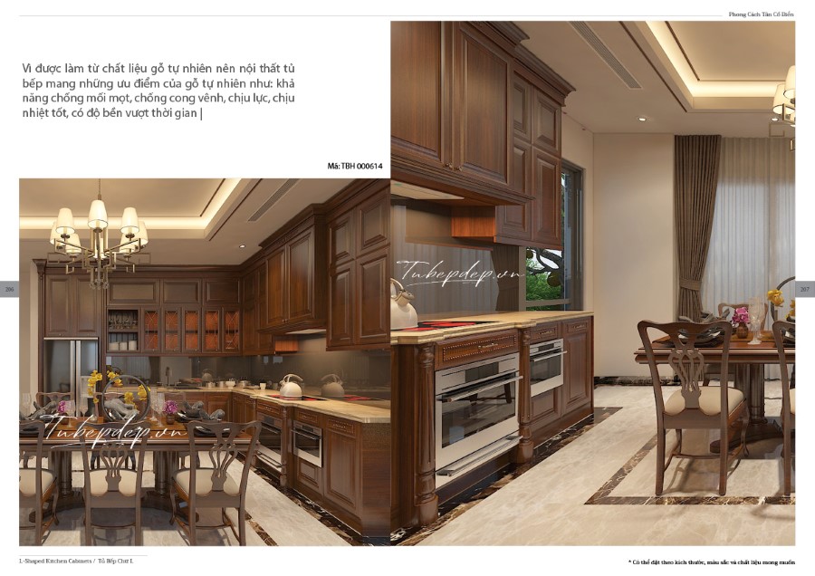 Một sự kết hợp độc đáo và lạ mắt giữa phong cách cổ điển và hiện đại, với nội thất bằng gỗ tự nhiên được thiết kế kiểu dáng truyền thống đặt trong một không gian hiện đại, với bố cục nội thất hiện đại, phù hợp biệt thự có diện tích phòng bếp lớn