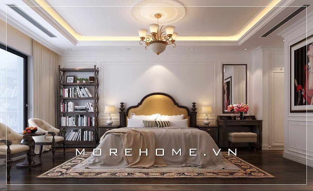 Thiết kế nội thất phòng ngủ biệt thự tân cổ điển, từng đường nét chạm khắc tỉ mỉ, sắc nét, những đường phào chỉ tinh tế... tất cả mang lại một không gian vô cùng sang trọng và đẳng cấp
