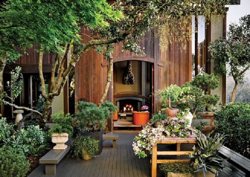 Trong sân nhà của căn biệt thự này là một khu vườn nhỏ với nhiều loài cây và hoa. Vừa trồng những loài thân thảo, lại có những loài dây leo, cả loài rễ cọc lẫn rễ chùm, khu vườn nhỏ xinh này mang hơi thở của một khu rừng rậm nhiệt đới um tùm hoa lá. Không những vậy, những bức tường còn được làm bằng gỗ góp phần làm cho không gian thêm phần thiên nhiên hơn.