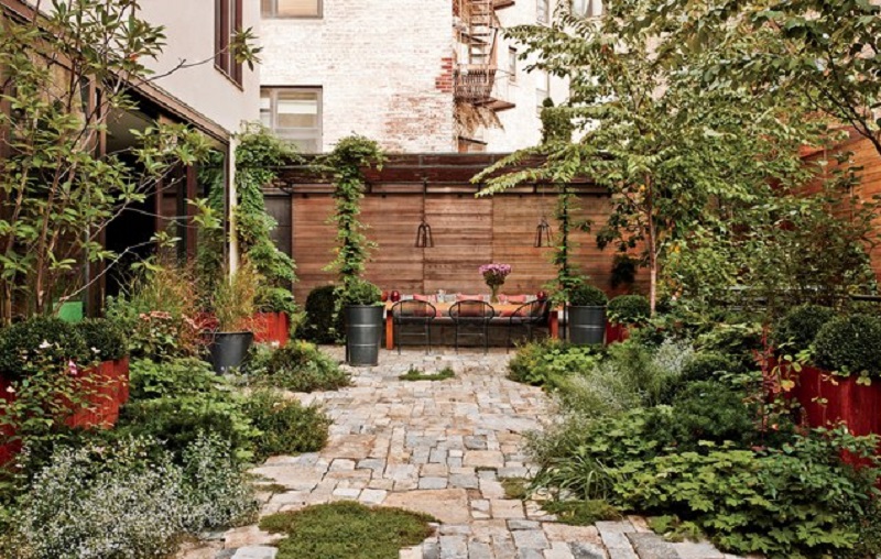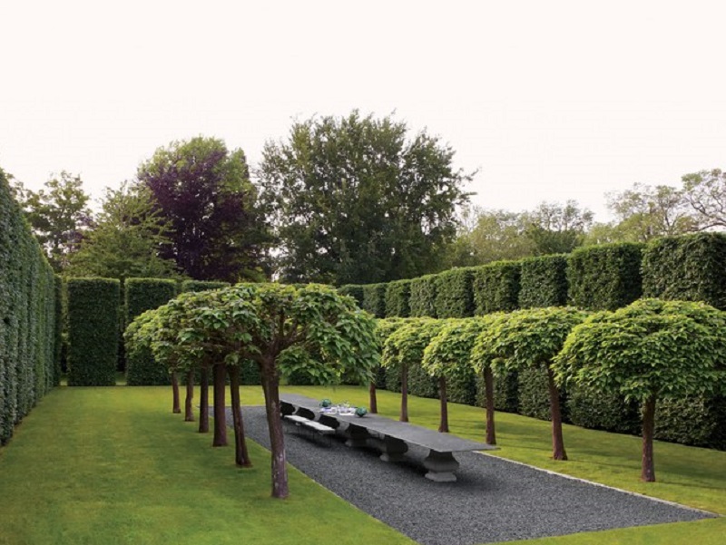 Bạn sẽ phải trầm trồ trước khu vườn xanh khép kín này. Những “bức tường” xanh tự nhiên được cắt tỉa tỉ mỉ, tạo thành những cái cột vuông vức, độc đáo. Ở giữa là một sân nhỏ rải đá, có bàn ghế ngồi nghỉ ngơi, thư giãn, hai bên là hai hàng cây tỏa bóng mát. Đây là một thiết kế độc đáo, đòi hỏi sự tính toán cũng như cần một bản thiết kế, chứ không đơn thuần chỉ là trồng cây.